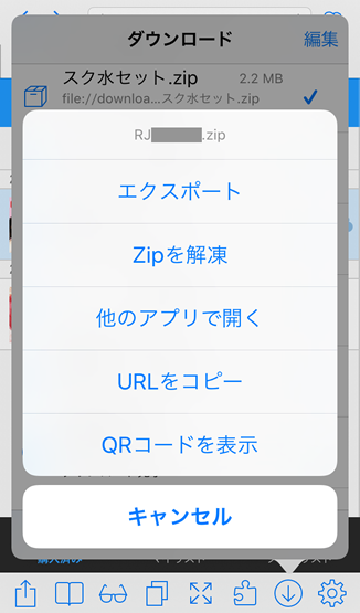 先程ダウンロードしましたzipファイルをタップして解凍しましょう。 ん、えーっと、スク水セットじゃないですよ〜。 RJの後に数字のzipファイルです。 スク水セットじゃないですってば。